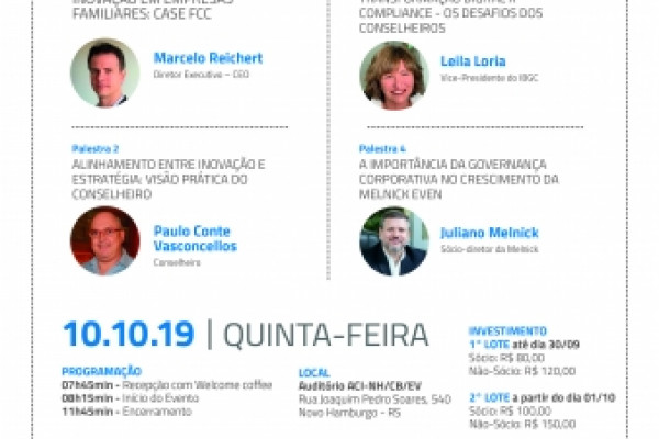 A vice-presidente do IBGC (Instituto Brasileiro de Governança Corporativa, Leila Loria, falará sobre “Transformação digital x compliance - os desafios dos conselheiros”, destacando tópicos como dever fiduciário x riscos, montagem da agenda dos conselhos, diversidade nos conselhos, aproximação do conselho dos negócios da empresa e dos acionistas, parceria entre conselho e gestão, e gestão de pessoas em empresas inovadoras. E o sócio-diretor da Melnick, Juliano Melnick, vai falar sobre “A importância da governança corporativa no crescimento da Melnick Even”, apresentando um breve histórico da empresa e a evolução da governança corporativa.