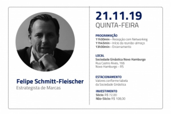 Novo Hamburgo/RS – O tema “Qual marca seu negócio quer deixar no mundo?” será debatido no Prato Principal de novembro, promovido pela Associação Comercial, Industrial e de Serviços de Novo Hamburgo, Campo Bom e Estância Velha. O estrategista de marcas, Felipe Schmitt-Fleischer, estará palestrando dia 21 de novembro, às 11h30min, na Sociedade Ginástica Novo Hamburgo.