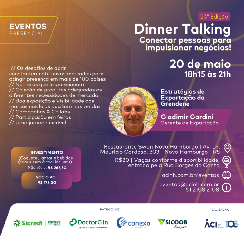 A receita bruta da Grendene com vendas ao exterior cresceu 40,4% em 2025, impulsionada por um salto de 88% nas exportações no segundo trimestre. As bem-sucedidas estratégias da empresa no mercado internacional serão apresentadas por Gladimir Gardini, gerente de exportação, na 23ª edição do Dinner Talking | Conectar pessoas para impulsionar negócios, no dia 20 de maio, das 18h15min às 21h.