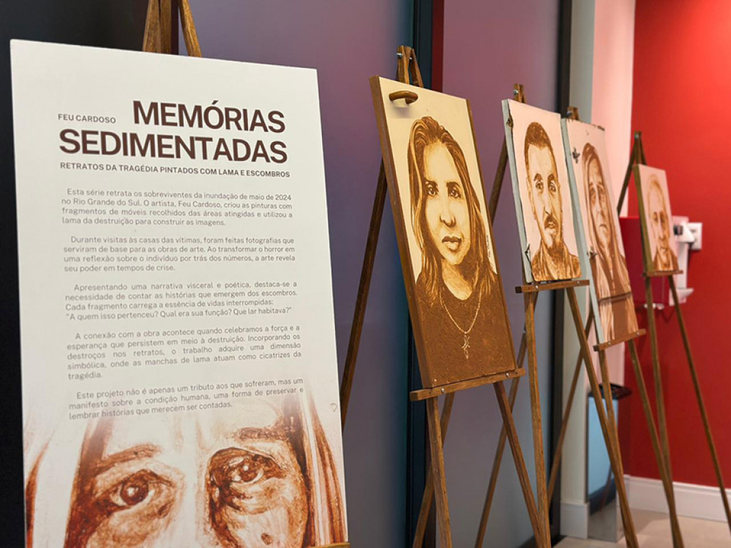 “A conexão com a obra acontece quando celebramos a força e a esperança que persistem em meio à destruição. Incorporando os destroços nos retratos, o trabalho adquire uma dimensão simbólica, onde as manchas de lama atuam como cicatrizes da tragédia. Este projeto não é apenas um tributo aos que sofreram, mas um manifesto sobre a condição humana, uma forma de preservar e lembrar de histórias que merecem ser contadas”, explica Feu.