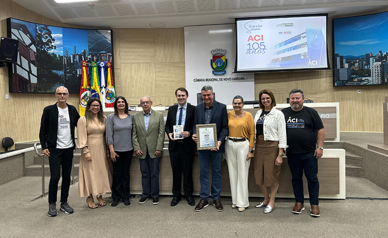 A Associação Comercial, Industrial e de Serviços de Novo Hamburgo, Campo Bom, Estância Velha, Dois Irmãos e Ivoti foi homenageada, na noite desta quinta-feira (13), em uma sessão solene da Câmara de Vereadores de Novo Hamburgo. A cerimônia, realizada às 19h, celebrou os 105 anos da entidade e ocorreu por proposição do vereador Felipe Kuhn Braun, aprovada por unanimidade pelos parlamentares.