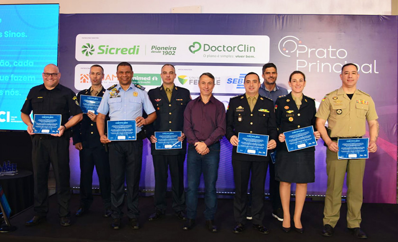 A ACI prestou homenagem a profissionais da segurança pública da sua região de atuação nesta quinta-feira, 27, durante o Prato Principal, no Hotel Swan Novo Hamburgo. A homenagem é o reconhecimento oficial da entidade à atuação do Corpo de Bombeiros, da Brigada Militar, da Polícia Civil e das guardas municipais em prol da segurança das empresas e das comunidades de Novo Hamburgo, Campo Bom, Estância Velha, Dois Irmãos e Ivoti. A cerimônia foi conduzida pelo presidente em exercício, Jair Roos.