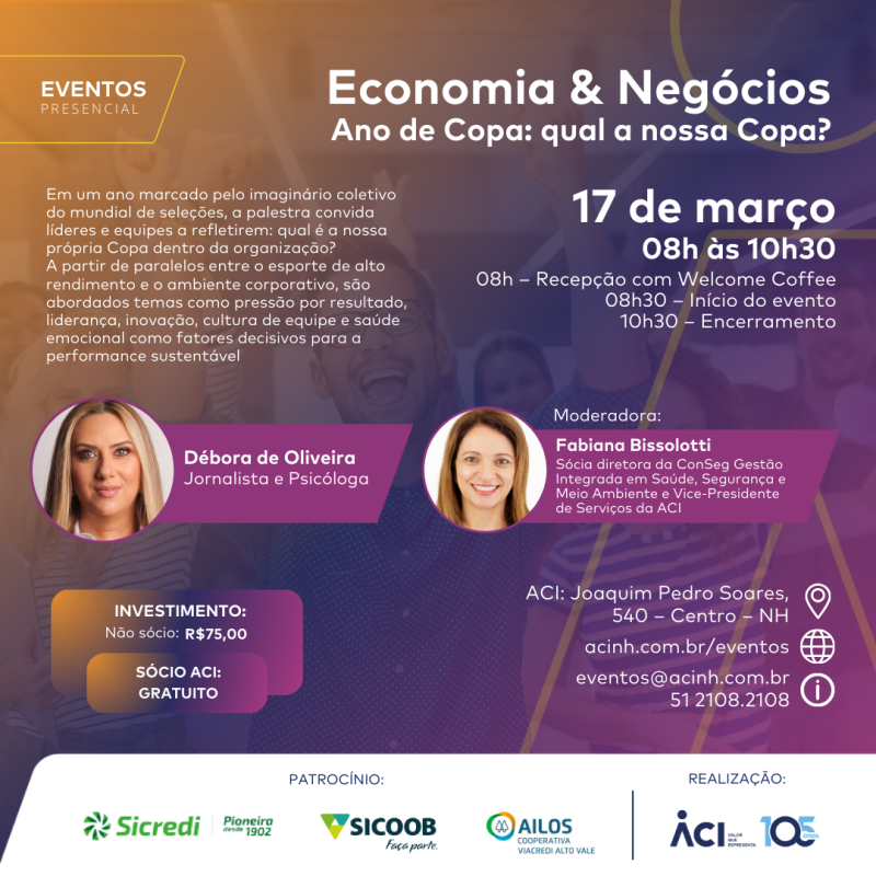Inscrições devem ser feitas em https://www.acinh.com.br/evento/economia-negocios-ano-de-copa-qual-a-nossa-copa