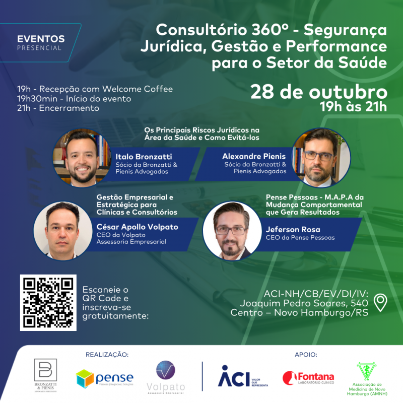 A atividade é gratuita para todos os interessados, que serão recepcionados com café de boas-vindas. A realização é de Bronzatti & Pienis Advogados, Pense Pessoas e Volpato Assessoria Empresarial, com o apoio de ACI, Laboratório Fontana e Associação dos Médicos de Novo Hamburgo.