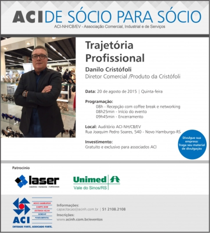 Novo Hamburgo/RS - O diretor Comercial/Produto da Cristófoli, Danilo Cristófoli, estará apresentando sua trajetória profissional no De Sócio para Sócio da Associação Comercial, Industrial e de Serviços de Novo Hamburgo, Campo Bom e Estância Velha, no dia 20 de agosto.