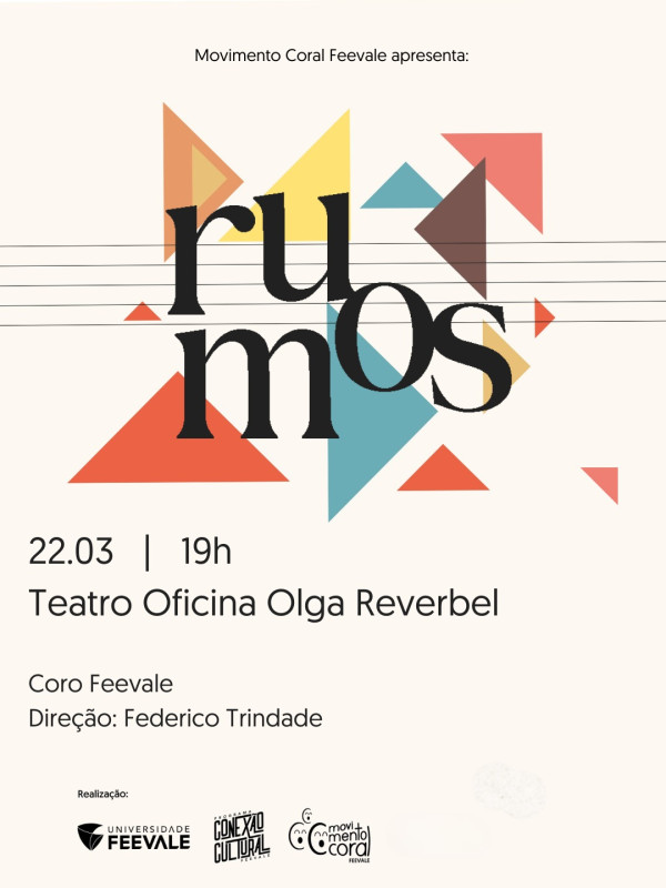 RUMOS é o novo espetáculo do Coro Feevale. Concebido e dirigido pelo maestro Federico Trindade, o concerto propõe um trajeto sonoro plural, conectando repertórios do universo popular, erudito e da criação coral contemporânea. A improvisação por meio do VOPA (Vocal Painting) surge como fio condutor do espetáculo, criando momentos de composição coletiva em tempo real e renovando a experiência a cada apresentação.
