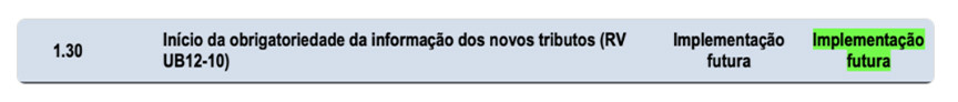 O documento cita que o “início da obrigatoriedade da informação dos novos tributos (RV UB12-10)”, trazido na versão 1.30, está sujeito a “Implementação futura”, ainda sem data definida.