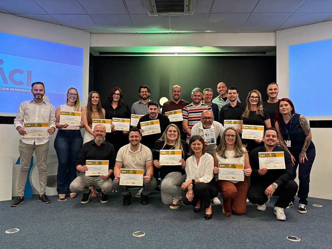 A turma de 2025 do curso Gestão e Desenvolvimento para a Excelência (GDE) teve sua formatura nesta quarta-feira, 22, no auditório da ACI. Na cerimônia, 17 profissionais, de 14 empresas da região, receberam o certificado de conclusão e um exemplar do livro Inspire-se e Inove – 10 Marcos de Inovação que Moldaram Nossa Região, recém lançado, das mãos do coordenador do curso, Sidnei Lopes Dias, do presidente da ACI, Robinson Klein, e da vice-presidente de Governança e Planejamento, Maria Cristina Bohnenberger.