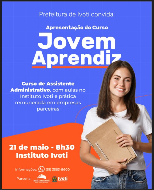 A Prefeitura de Ivoti e o no Instituto Ivoti apresentam, na próxima quarta-feira, 21, às 8h30min, na instituição de ensino, o curso de formação de assistente administrativo para jovens aprendizes. Na oportunidade, serão apresentadas informações sobre o curso, cujas aulas ocorrerão no Instituto Ivoti e práticas serão realizadas em empresas parceiras.