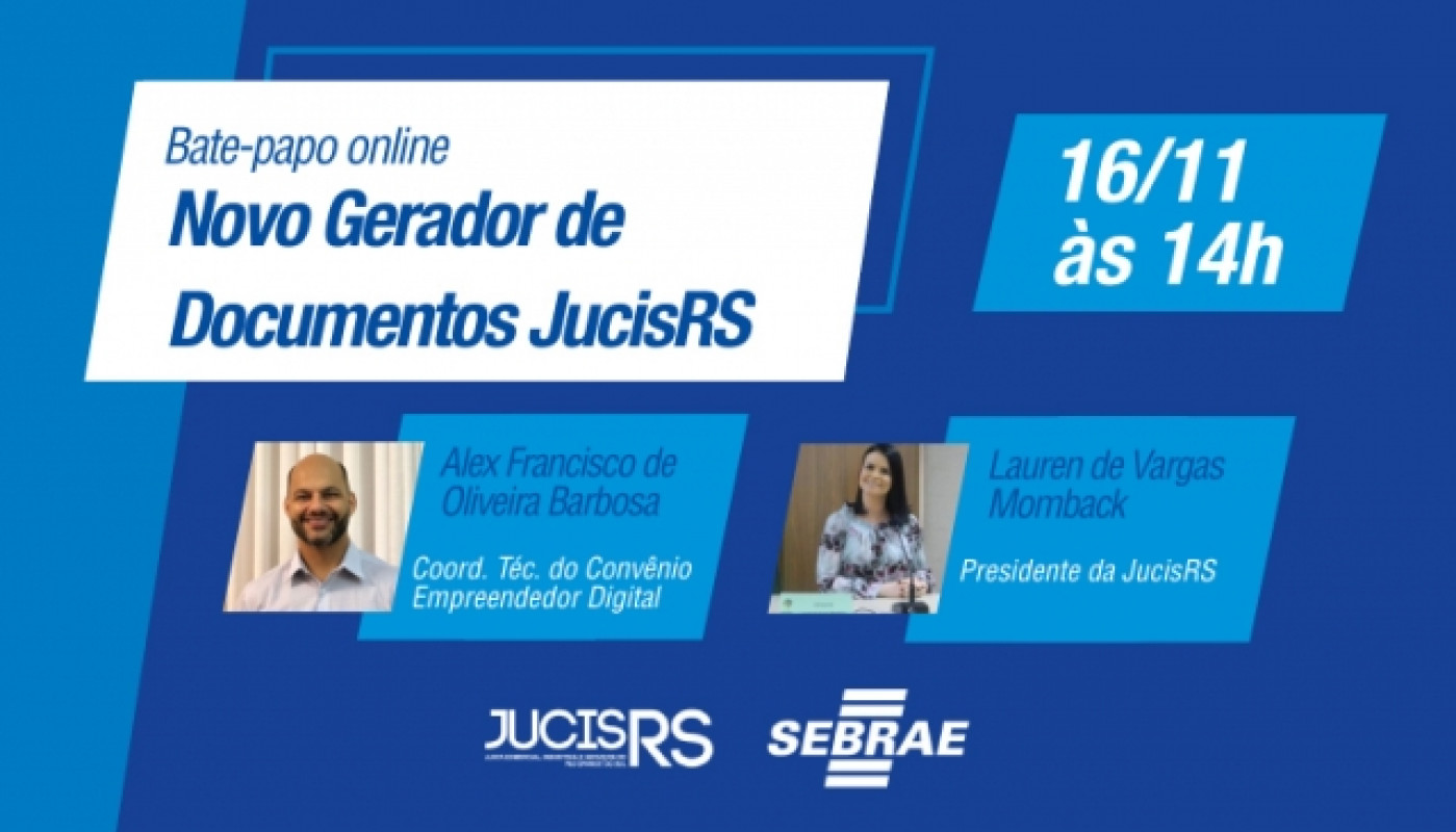 No próximo dia 16, às 14h,uma live vai apresentar as funcionalidades do novo gerador de documentos para simplificar o registro de empresas na JucisRS. Os pontos que serão abordados são: geração de documentos para empresário individual e sociedade LTDA, documentos de constituição, alteração e extinção.