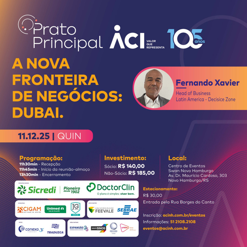 Inscrições devem ser feitass em https://www.acinh.com.br/evento/prato-principal-a-nova-fronteira-de-negocios-dubai