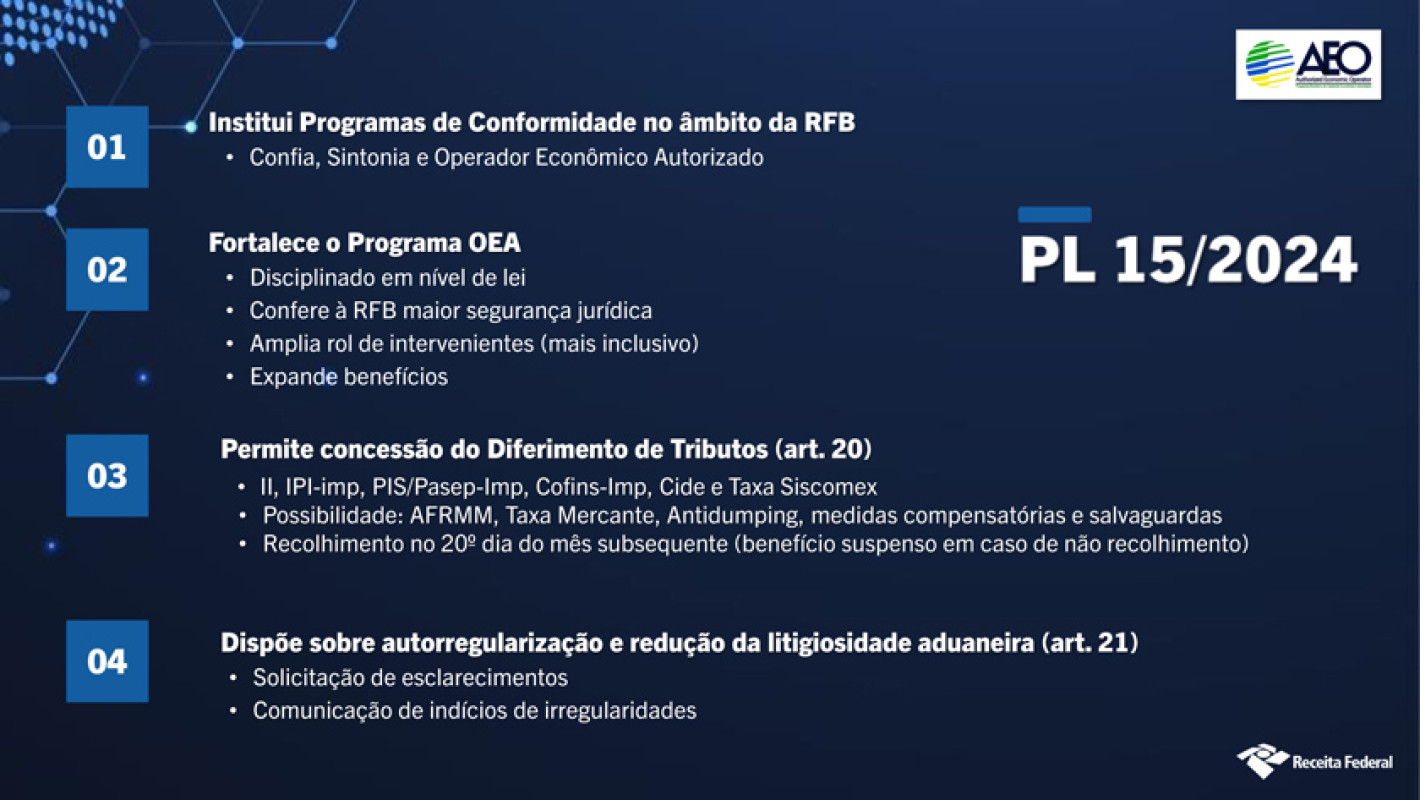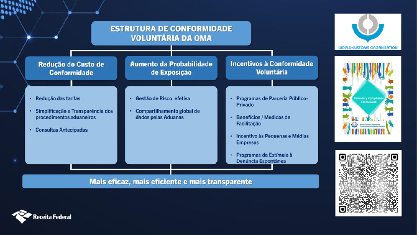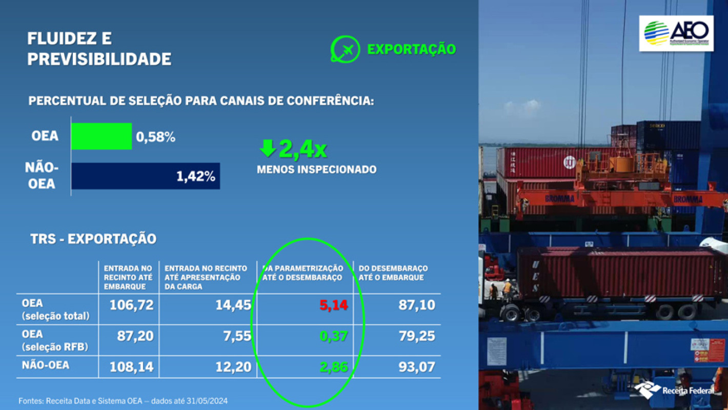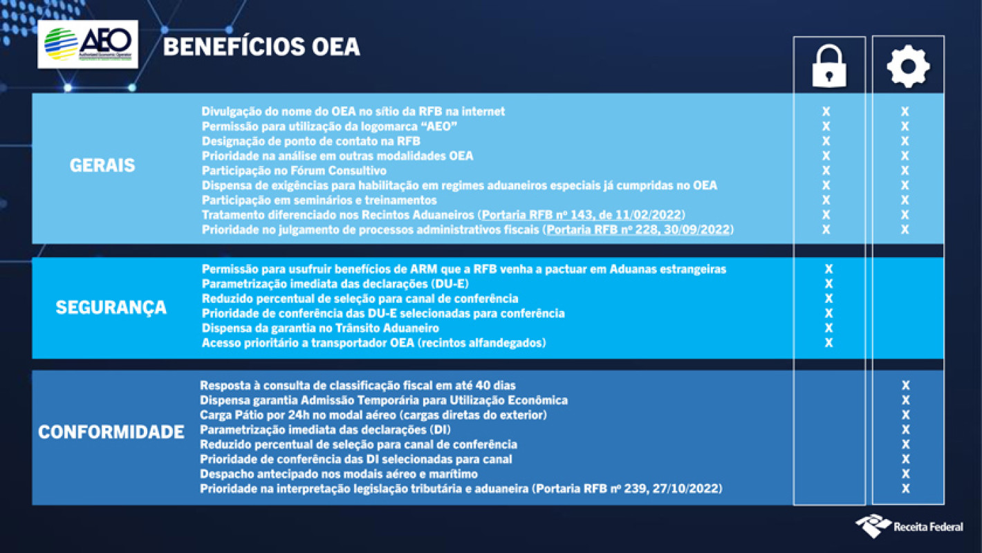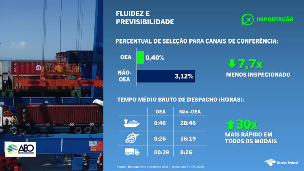 O Programa Brasileiro de OEA visa a fortalecer a segurança da cadeia de suprimentos internacional e estimular o cumprimento voluntário da legislação tributária e aduaneira. Alinha-se à estrutura de conformidade voluntária da Organização Mundial de Aduanas (OMA), que busca reduzir o custo de conformidade, aumentar a probabilidade de exposição e incentivar a conformidade voluntária. “Em resumo, o objetivo é tornar a aduana mais eficaz, eficiente e transparente”, acrescentou.