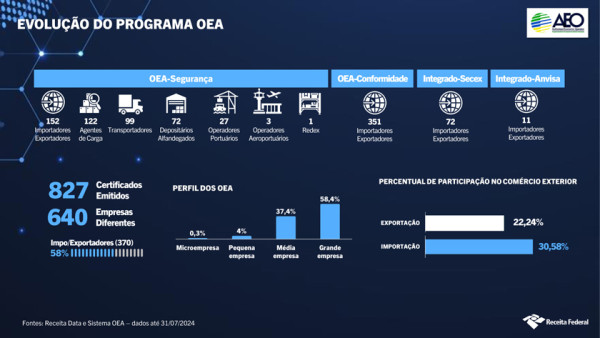 Em todo o mundo, mais de 130 países têm Programas OEA e mais de 40 mil empresas já são certificadas. No Brasil, onde o Programa OEA teve início em 2015, já foram emitidos 827 certificados para 640 empresas diferentes. 370 delas são importadoras e exportadoras, equivalentes a 58% do total. Médias e grandes empresas representam 37,4% e 58,4%, respectivamente, do total. O programa possui quatro classificações: OEA-Segurança, OEA-Conformidade, Integrado-Secex e Integrado-Anvisa