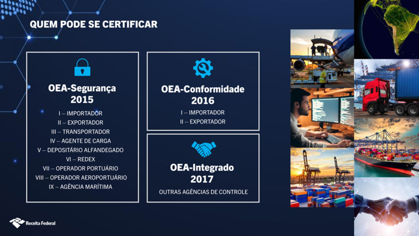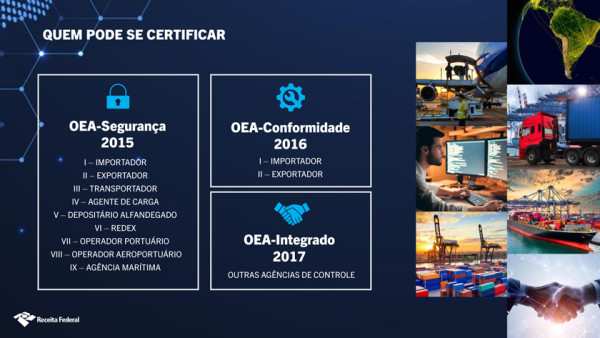 - OEA-Segurança: importador, exportador, transportador, agente de carga, depositário alfandegado, redex, operador portuário, operador aeroportuário e agência marítima.