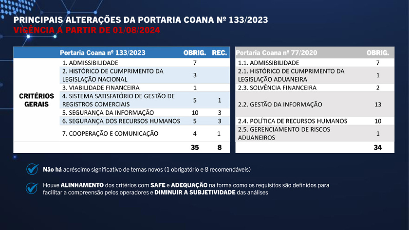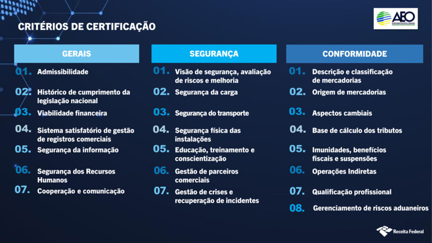 Os critérios de certificação são gerais (admissibilidade e histórico de cumprimento da legislação nacional, por exemplo), de segurança (visão de segurança, avaliação de riscos e melhoria, entre outros) e de conformidade (como descrição e classificação de mercadorias e Gerenciamento de riscos aduaneiros).