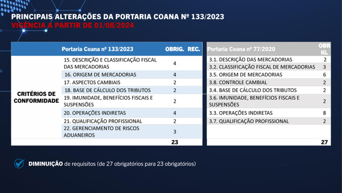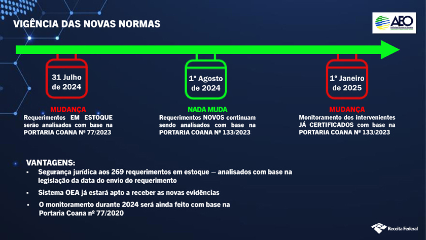 A entrada em vigor da IN RFB nº 2154/2023 e da Portaria Coana nº 133/2023, no último dia 01 de agosto, promove maior alinhamento do Programa Brasileiro de Operador Econômico Autorizado – OEA com as diretrizes da Organização Mundial das Aduanas (OMA) e muda o processo de análise dos requerimentos das empresas.