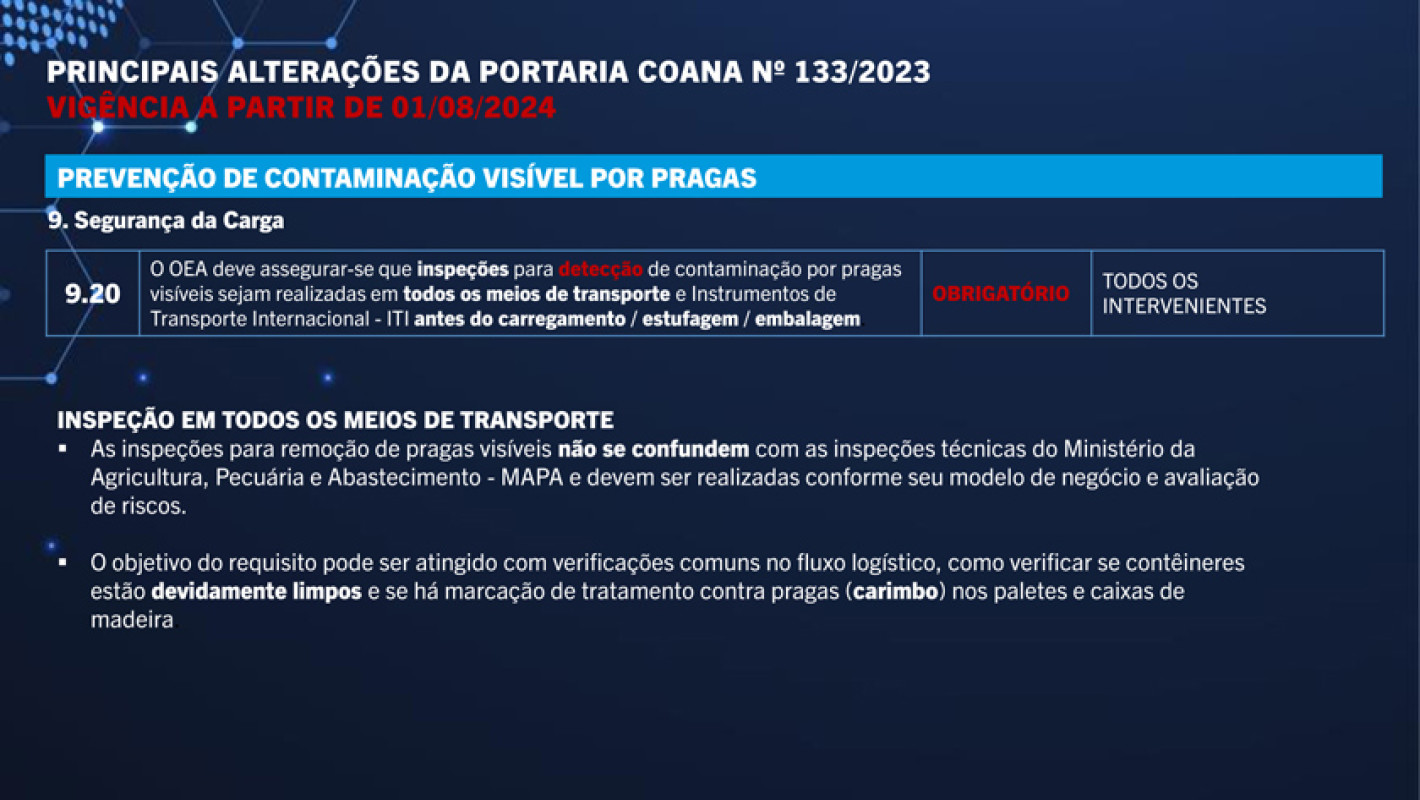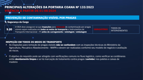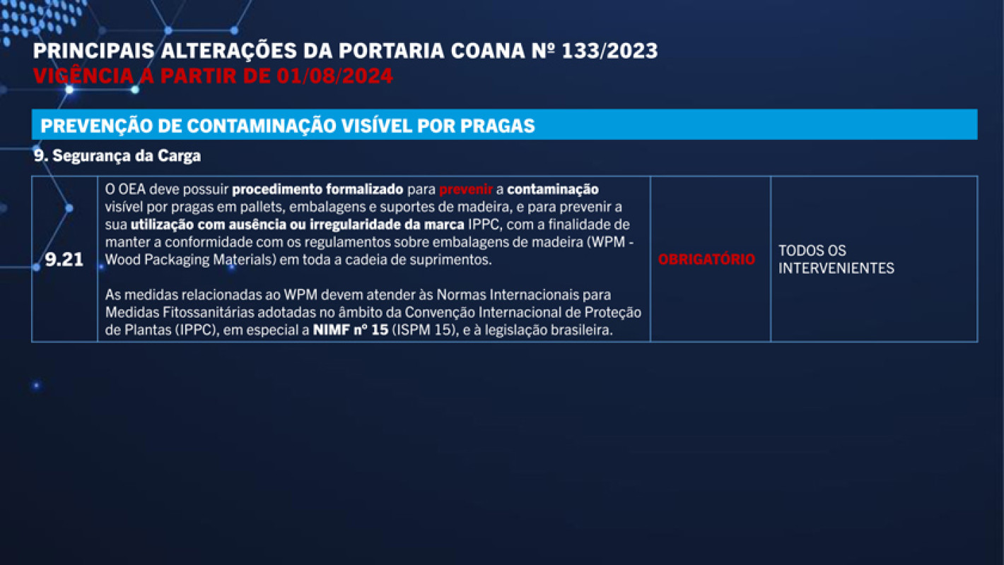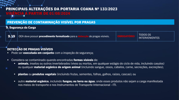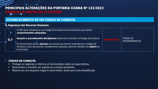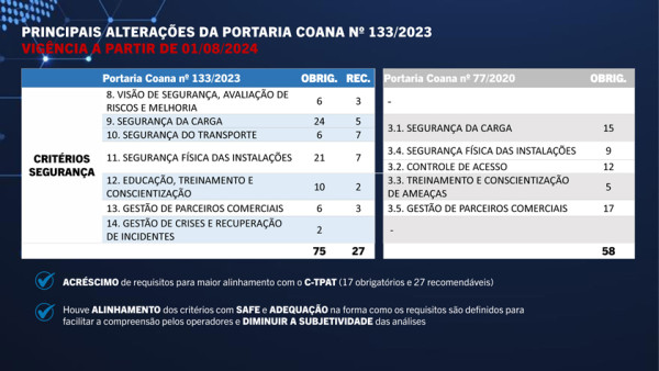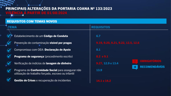Conforme Barros, a primeira mudança é nos requerimentos em estoque em 31 de julho último, que serão analisados com base na Portaria Coana nº 77/2023. Já para os requerimentos novos, a partir de 01 de agosto, nada muda. Estes continuam sendo analisados com base na Portaria Coana nº 133/2023. Outra mudança ocorrerá em 01 de janeiro de 2025, quando o monitoramento dos intervenientes já certificados passará a ser feito com base na Portaria Coana Nº 133/2023.