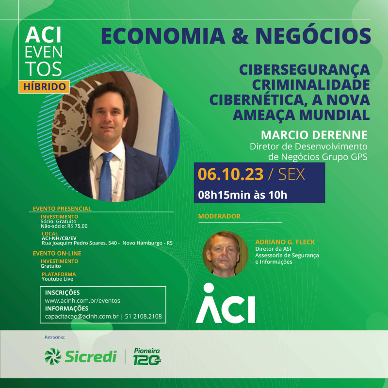 O Economia & Negócios que a ACI agendou para esta sexta-feira, dia 06, vai abordar um tema que preocupa pessoas físicas e jurídicas. Cibersegurança - criminalidade cibernética, a nova ameaça mundial é o título da palestra que Marcio Derenne, diretor de desenvolvimento de negócios do Grupo GPS, realizará com moderação de Adriano G. Fleck, diretor da ASI Assessoria de Segurança e Informações.